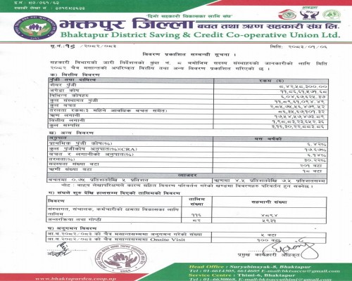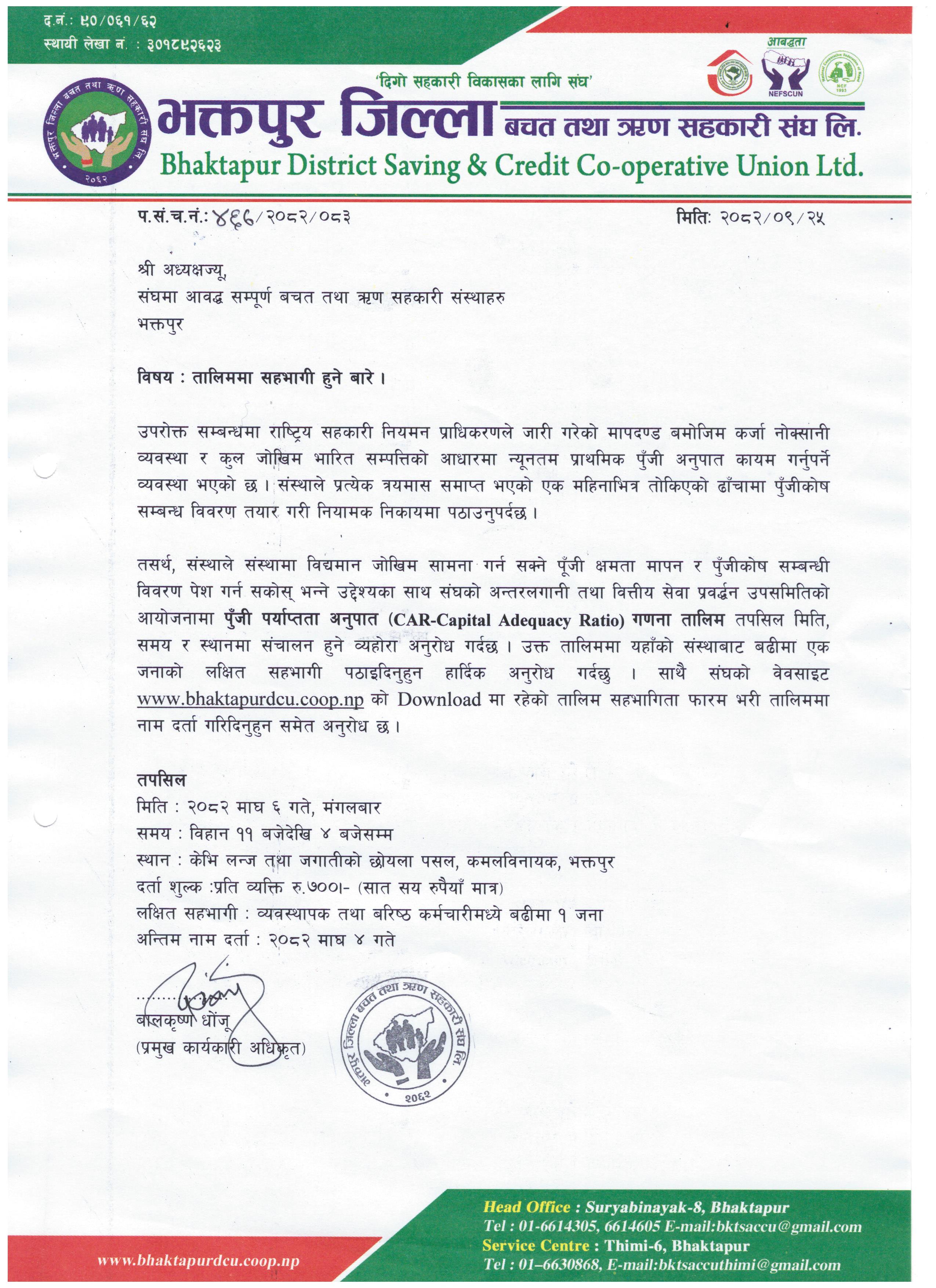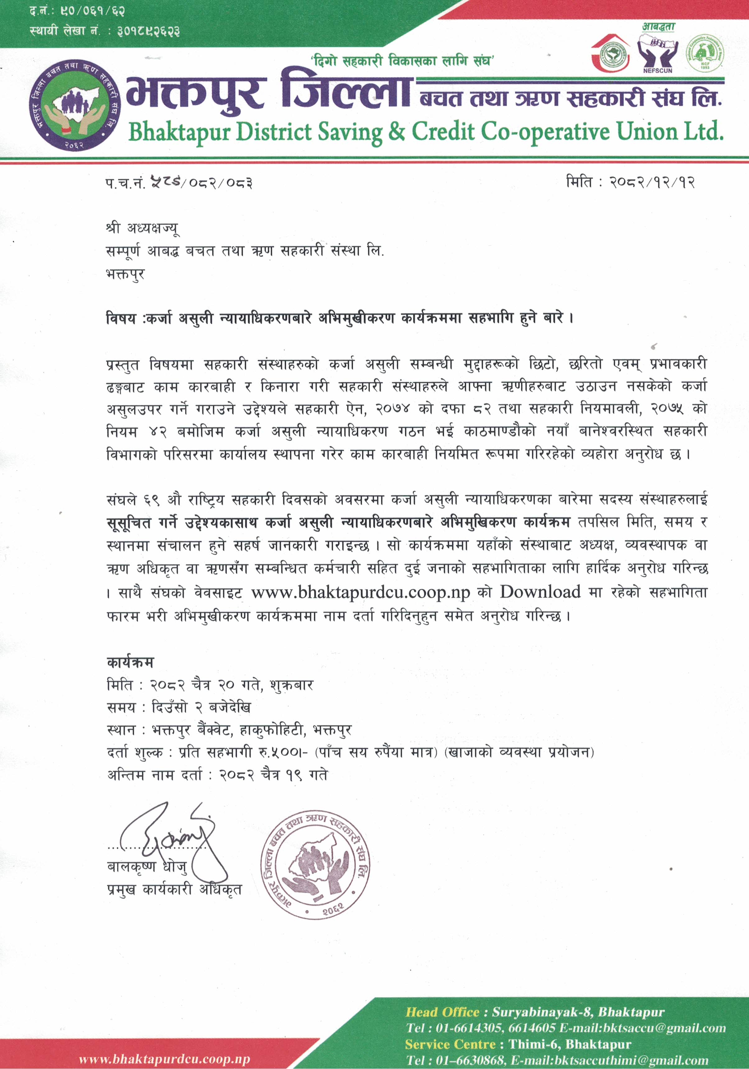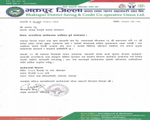 सहकारी मूल्य, मान्यता एवम् सिद्धान्तलाई आत्मसात गर्दै समुदायमा आधारित बचत तथा ऋण सहकारी संस्थाहरुलाई स्थानीय स्तरमा विकास गर्न, गैर समुदायमा आधारित बचत तथा ऋण सहकारी संस्थाहरुलाई निरुत्साहित पार्नुका साथै सहकारी क्षेत्रमा देखापरेको विकृति विसंगति हटाई सहकारी आन्दोलनलाई सही दिशामा अगाडी बढाउन तड्कारो आवश्यकता बोध भएकोले सिद्धि गणेश बचत तथा ऋण सहकारी संस्थाको आयोजनामा “बचत तथा ऋण सहकारी संस्थाहरुमा देखापरेको विकृति, विसंगति तथा त्यसका निराकरण” विषयक अन्र्तक्रिया कार्यक्रम २०५६ साल चैत्र १३ गते सम्पन्न भएको थियो । सोही कार्यक्रममा जिल्लामा एउटा सामूहिक छाता संगठनको रुपमा जिल्ला संघको औचित्यता बारे बस्तुगत अध्ययन गर्न एक कार्यदलको गठन भई ३१ चैत्र २०५८ मा नेफ्स्कूनका पुर्व केन्द्रीय अध्यक्ष श्री कैलाशभक्त प्रधानाङ्ग ज्यूको समूपस्थितिमा प्रतिवेदन पेश भई श्री राजेन्द्र दुमरु ज्यूको संयोजकत्वमा ७ सदस्यीय तदर्थ समिति गठन भएको थियो । उक्त तदर्थ समितिले ८ असार २०५९ मा संघ गठन गर्न प्रारम्भिक भेला आयोजना गरी जिल्ला बचत तथा ऋण सहकारी संघ लि.भक्तपुर नाम रहने गरी श्री राजेन्द्र दुमरु ज्यूको अध्यक्षतामा ७ सदस्यीय संचालक समिति गठन गरेको थियो । विभिन्न आरोह अवरोह पार गरी लामो समयको अन्तराल पछि २०६२ बैशाख २१ गते विधिवत रुपमा संघको स्थापना भएको हो । हाल यस संघ भक्तपुर जिल्ला सुर्यविनायक नगरपालिका वडा नं.८, सुर्यविनायकमा अाफ्नै भवनबाट कार्यालय संचालन गरी सदस्यहरुलाई निरन्तर सेवा प्रदान गर्दै आईरहेको छ ।