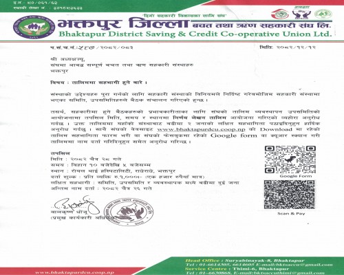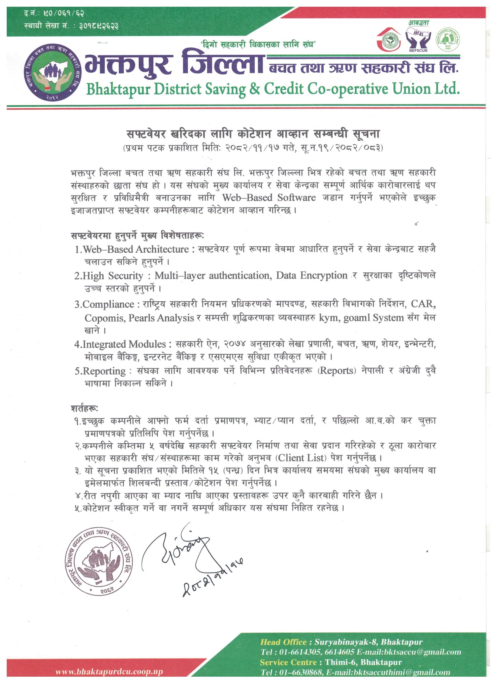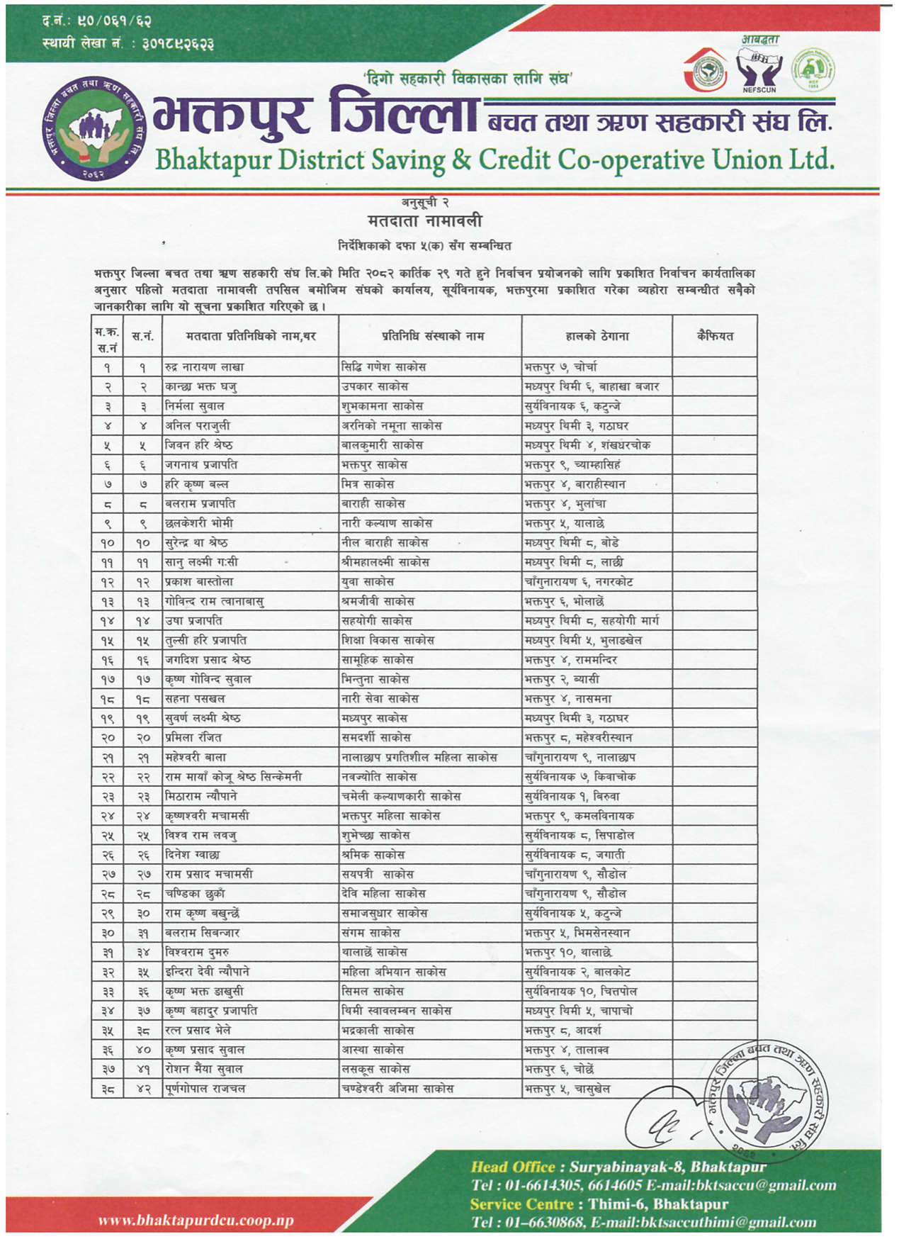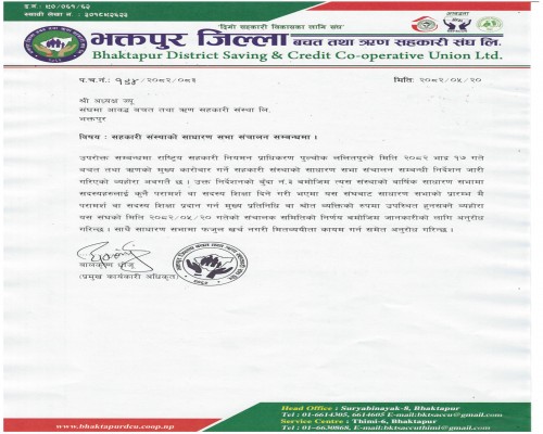 सहकारी मूल्य, मान्यता एवम् सिद्धान्तलाई आत्मसात गर्दै समुदायमा आधारित बचत तथा ऋण सहकारी संस्थाहरुलाई स्थानीय स्तरमा विकास गर्न, गैर समुदायमा आधारित बचत तथा ऋण सहकारी संस्थाहरुलाई निरुत्साहित पार्नुका साथै सहकारी क्षेत्रमा देखापरेको विकृति विसंगति हटाई सहकारी आन्दोलनलाई सही दिशामा अगाडी बढाउन तड्कारो आवश्यकता बोध भएकोले सिद्धि गणेश बचत तथा ऋण सहकारी संस्थाको आयोजनामा “बचत तथा ऋण सहकारी संस्थाहरुमा देखापरेको विकृति, विसंगति तथा त्यसका निराकरण” विषयक अन्र्तक्रिया कार्यक्रम २०५६ साल चैत्र १३ गते सम्पन्न भएको थियो । सोही कार्यक्रममा जिल्लामा एउटा सामूहिक छाता संगठनको रुपमा जिल्ला संघको औचित्यता बारे बस्तुगत अध्ययन गर्न एक कार्यदलको गठन भई ३१ चैत्र २०५८ मा नेफ्स्कूनका पुर्व केन्द्रीय अध्यक्ष श्री कैलाशभक्त प्रधानाङ्ग ज्यूको समूपस्थितिमा प्रतिवेदन पेश भई श्री राजेन्द्र दुमरु ज्यूको संयोजकत्वमा ७ सदस्यीय तदर्थ समिति गठन भएको थियो । उक्त तदर्थ समितिले ८ असार २०५९ मा संघ गठन गर्न प्रारम्भिक भेला आयोजना गरी जिल्ला बचत तथा ऋण सहकारी संघ लि.भक्तपुर नाम रहने गरी श्री राजेन्द्र दुमरु ज्यूको अध्यक्षतामा ७ सदस्यीय संचालक समिति गठन गरेको थियो । विभिन्न आरोह अवरोह पार गरी लामो समयको अन्तराल पछि २०६२ बैशाख २१ गते विधिवत रुपमा संघको स्थापना भएको हो । हाल यस संघ भक्तपुर जिल्ला सुर्यविनायक नगरपालिका वडा नं.८, सुर्यविनायकमा अाफ्नै भवनबाट कार्यालय संचालन गरी सदस्यहरुलाई निरन्तर सेवा प्रदान गर्दै आईरहेको छ ।