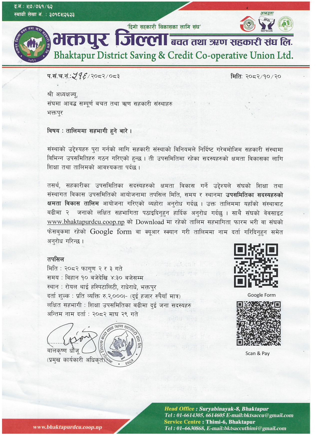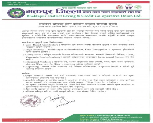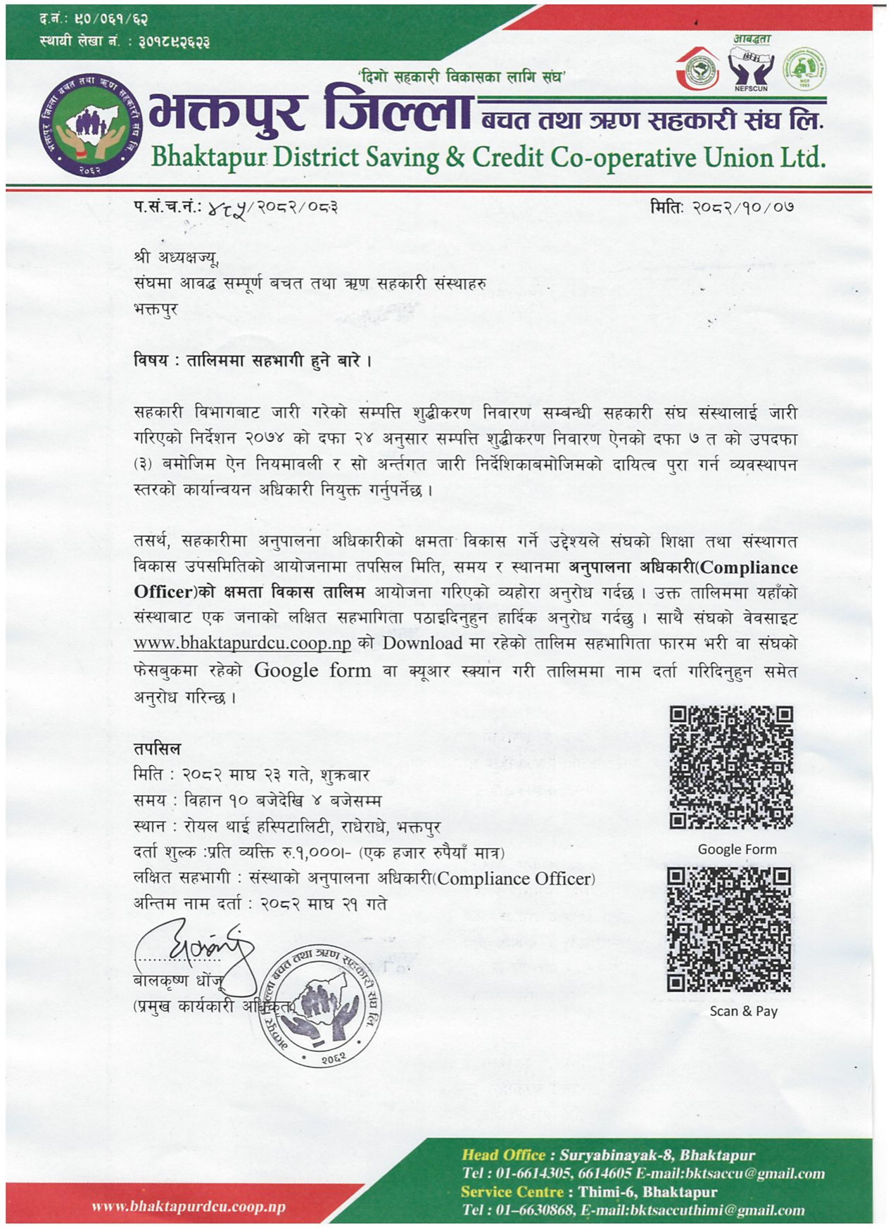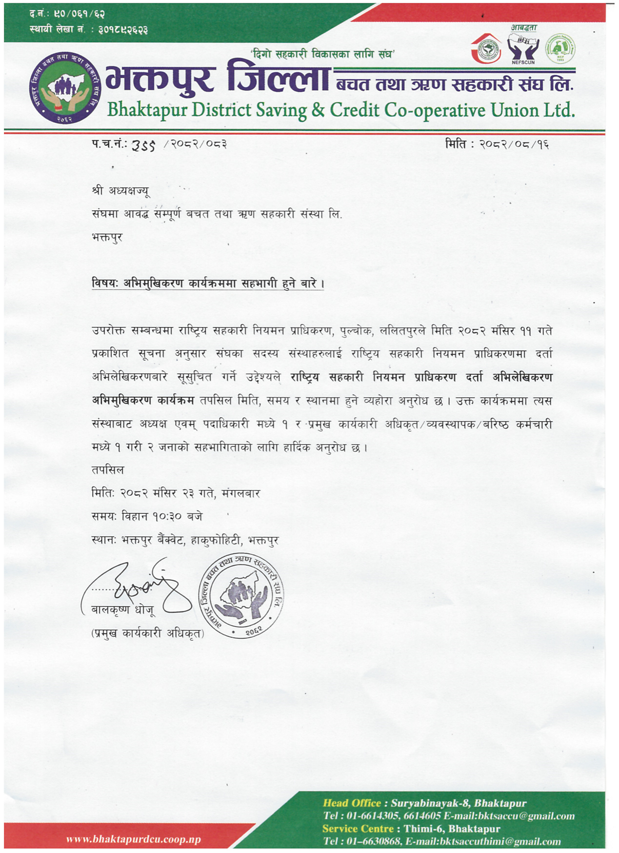 सहकारी मूल्य, मान्यता एवम् सिद्धान्तलाई आत्मसात गर्दै समुदायमा आधारित बचत तथा ऋण सहकारी संस्थाहरुलाई स्थानीय स्तरमा विकास गर्न, गैर समुदायमा आधारित बचत तथा ऋण सहकारी संस्थाहरुलाई निरुत्साहित पार्नुका साथै सहकारी क्षेत्रमा देखापरेको विकृति विसंगति हटाई सहकारी आन्दोलनलाई सही दिशामा अगाडी बढाउन तड्कारो आवश्यकता बोध भएकोले सिद्धि गणेश बचत तथा ऋण सहकारी संस्थाको आयोजनामा “बचत तथा ऋण सहकारी संस्थाहरुमा देखापरेको विकृति, विसंगति तथा त्यसका निराकरण” विषयक अन्र्तक्रिया कार्यक्रम २०५६ साल चैत्र १३ गते सम्पन्न भएको थियो । सोही कार्यक्रममा जिल्लामा एउटा सामूहिक छाता संगठनको रुपमा जिल्ला संघको औचित्यता बारे बस्तुगत अध्ययन गर्न एक कार्यदलको गठन भई ३१ चैत्र २०५८ मा नेफ्स्कूनका पुर्व केन्द्रीय अध्यक्ष श्री कैलाशभक्त प्रधानाङ्ग ज्यूको समूपस्थितिमा प्रतिवेदन पेश भई श्री राजेन्द्र दुमरु ज्यूको संयोजकत्वमा ७ सदस्यीय तदर्थ समिति गठन भएको थियो । उक्त तदर्थ समितिले ८ असार २०५९ मा संघ गठन गर्न प्रारम्भिक भेला आयोजना गरी जिल्ला बचत तथा ऋण सहकारी संघ लि.भक्तपुर नाम रहने गरी श्री राजेन्द्र दुमरु ज्यूको अध्यक्षतामा ७ सदस्यीय संचालक समिति गठन गरेको थियो । विभिन्न आरोह अवरोह पार गरी लामो समयको अन्तराल पछि २०६२ बैशाख २१ गते विधिवत रुपमा संघको स्थापना भएको हो । हाल यस संघ भक्तपुर जिल्ला सुर्यविनायक नगरपालिका वडा नं.८, सुर्यविनायकमा अाफ्नै भवनबाट कार्यालय संचालन गरी सदस्यहरुलाई निरन्तर सेवा प्रदान गर्दै आईरहेको छ ।